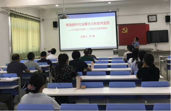 接着,我院党员教师孔丽同志以《擘画新时代治蜀兴川的宏伟蓝图--中共四川省第十二次党代会精神解读》为题,讲授了一堂生动的党课,助推全体党员教师进一步准确把握省第十二次党代会精神。