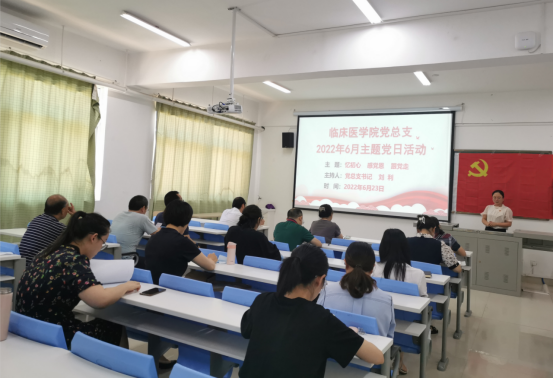 为巩固党史学习教育成果,培养临床医学院党员教师赓续红色血脉、厚植大医情怀、凝聚奋进力量,6月23日中午,学院党总支组织开展了“忆初心 感党恩 跟党走”主题党日活动。党总支书记刘利主持会议。
