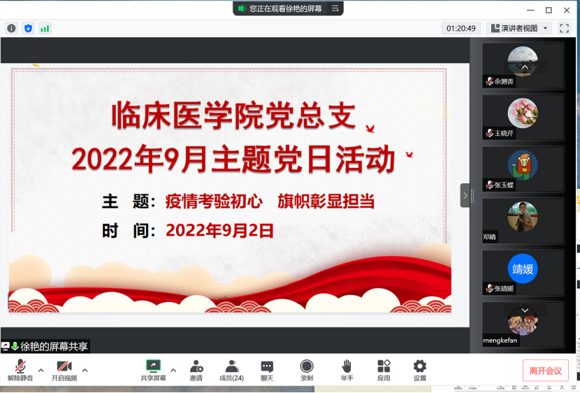 为深入贯彻落实习近平总书记和党中央关于疫情防控工作的重大决策部署,做好2022年秋季学期教育教学和疫情防控工作,9月2日晚上,临床医学院党总支开展了“疫情考验初心 旗帜彰显担当”在线网络主题党日活动。活动由党总支委员、专职组织员徐艳同志主持。党总支党员参加了活动。