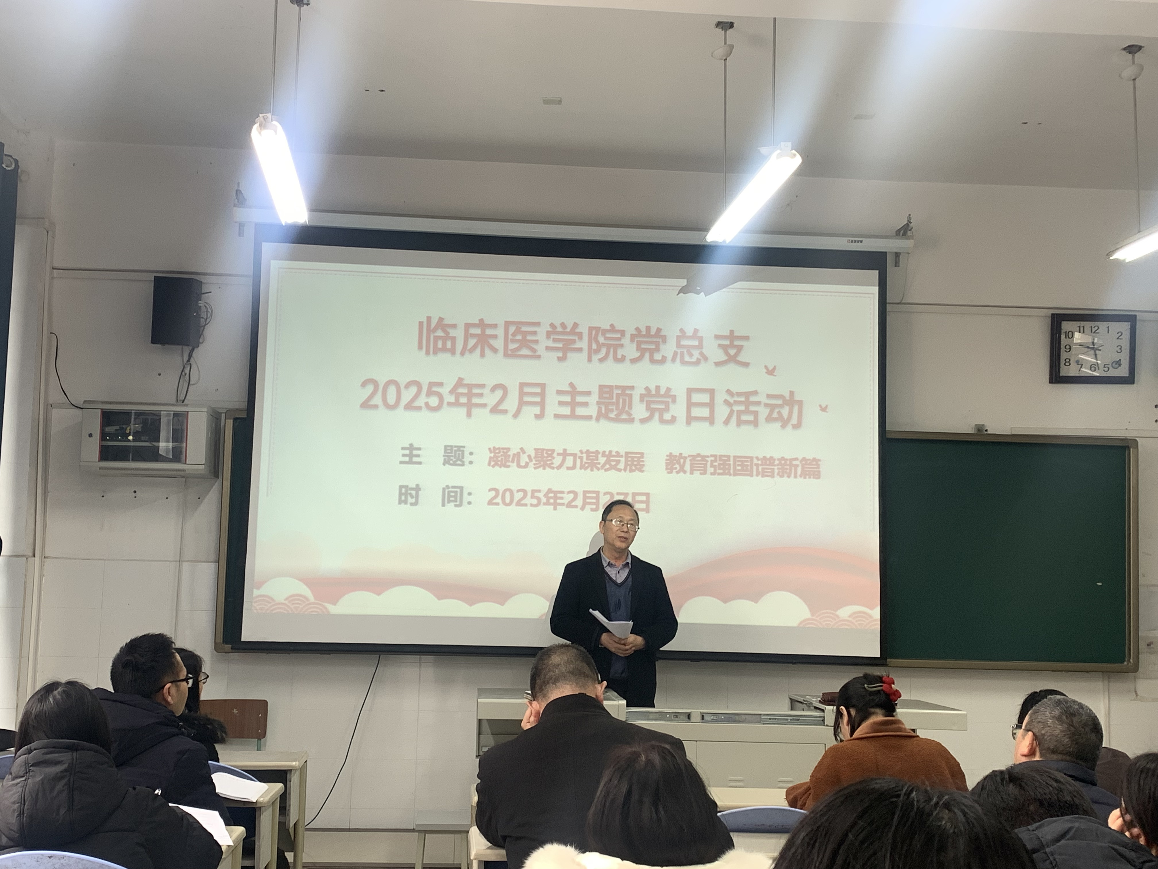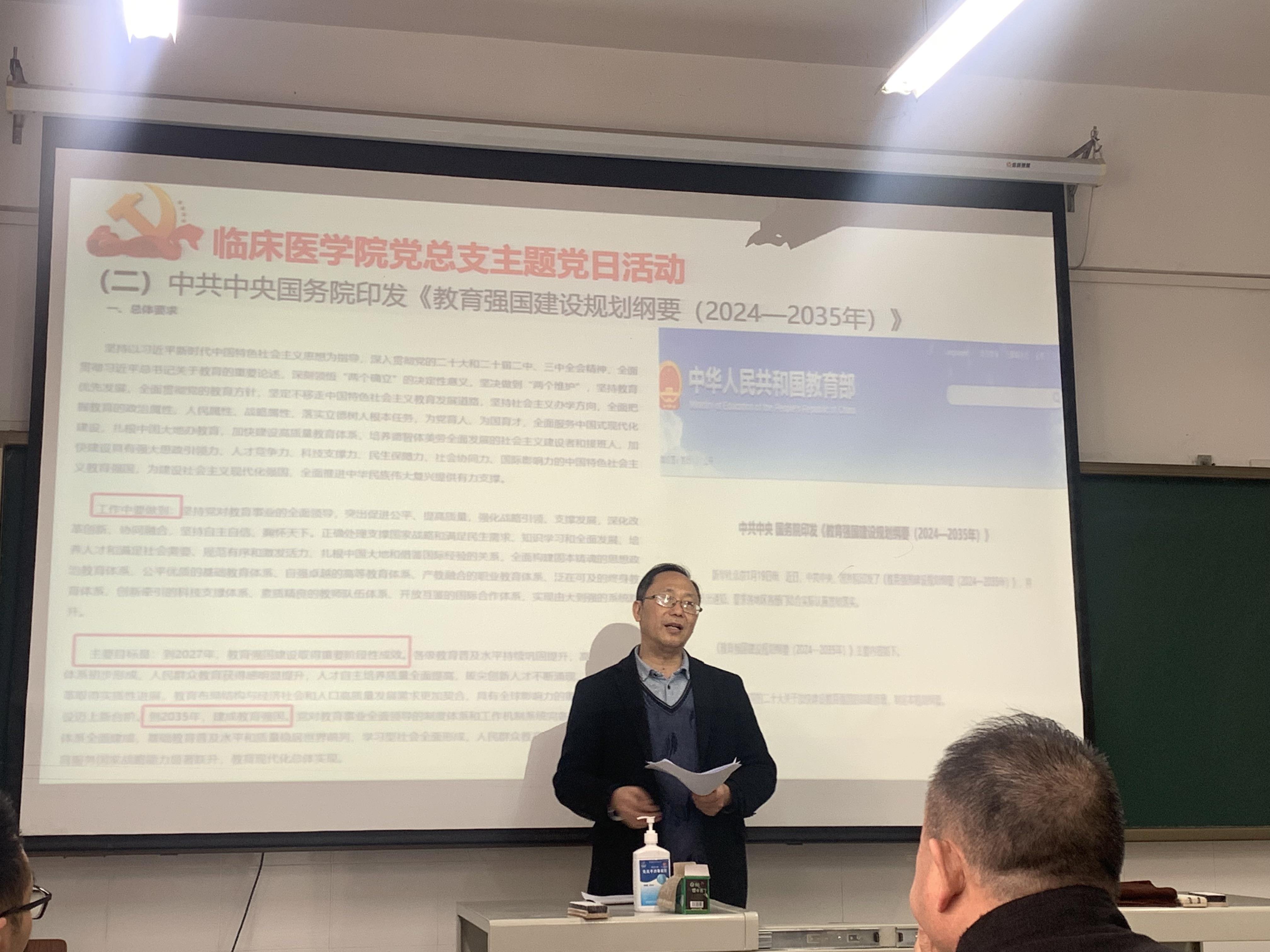 为深入学习贯彻党的教育方针,进一步凝聚党员力量,激发党员的责任感与使命感,推动临床医学院新学期各项工作的高质量开展,2月27日,临床医学院党总支在南园529召开了“凝心聚力谋发展 教育强国谱新篇”主题党日活动。