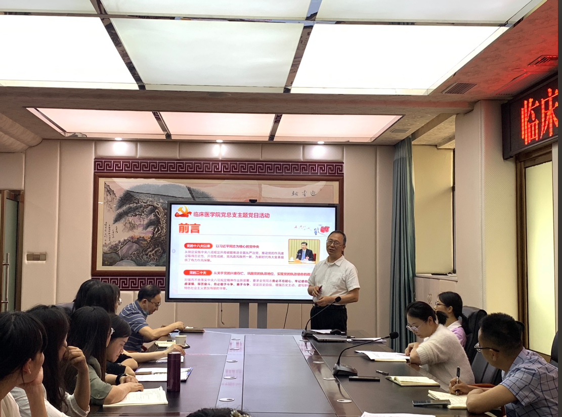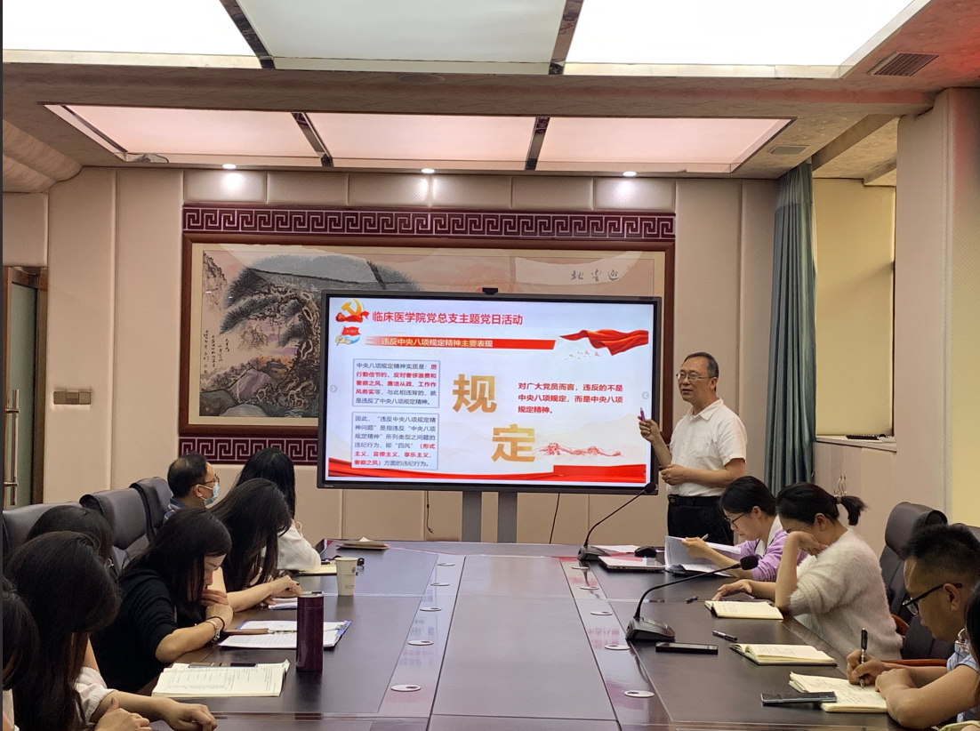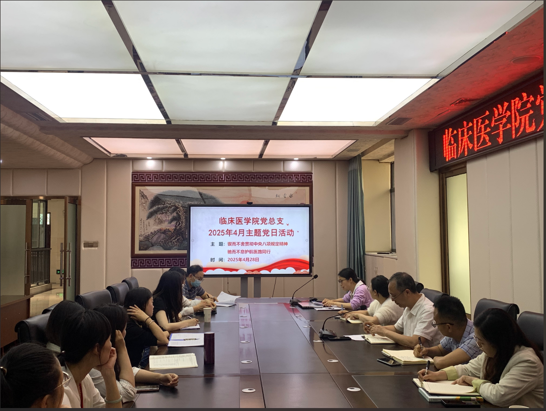 为深入贯彻落实中央八项规定精神,持续深化作风建设,4月28日下午,临床医学院党总支在南园综合楼第四会议室召开了以“锲而不舍贯彻中央八项规定精神 驰而不息护航医路同行”为主题的主题党日活动。活动由党总支书记古仕明主持,全体党员参加。