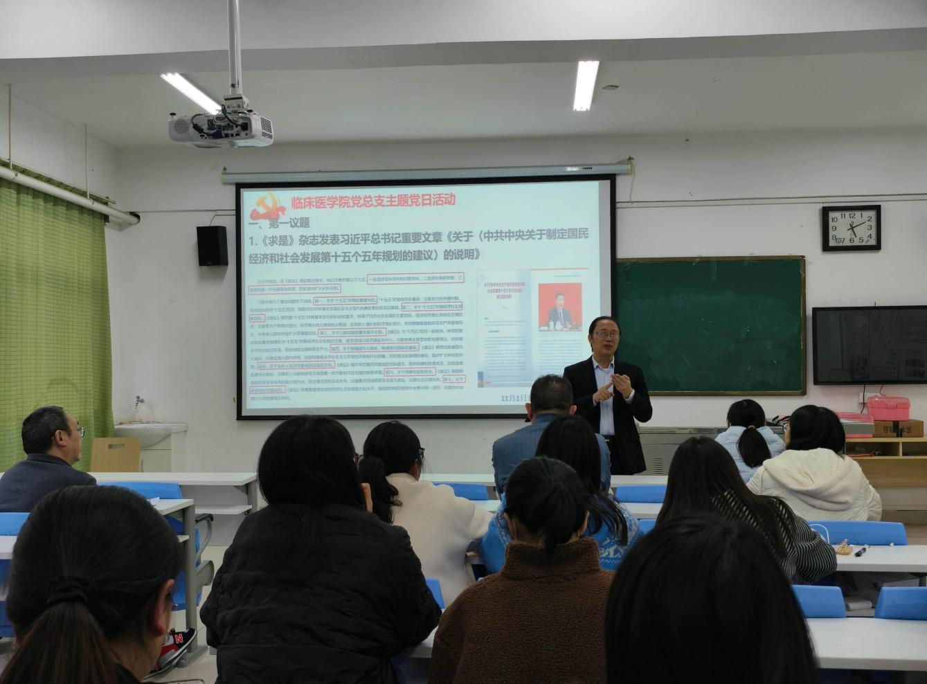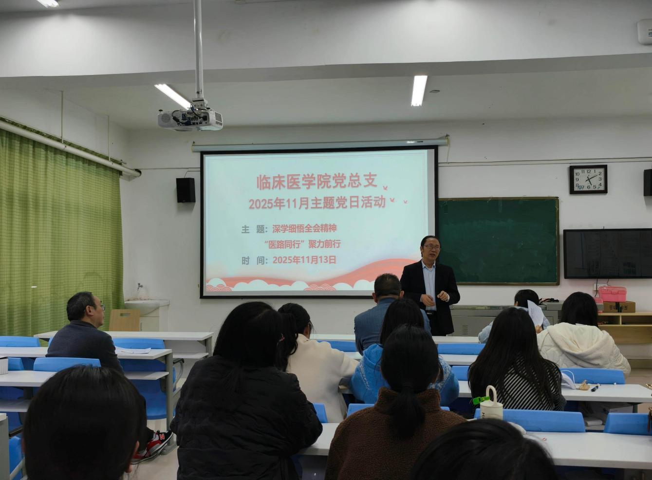 为深入学习贯彻党的二十届四中全会精神,强化党员意识形态教育,2025年11月13日下午,临床医学院党总支在2号实验楼303教室召开“深学细悟全会精神 医路同行聚力前行”主题党日活动,学院全体党员参加。