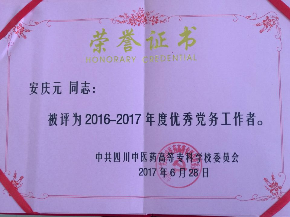 我系党支部书记安庆元同志荣获“优秀共产党员”称号