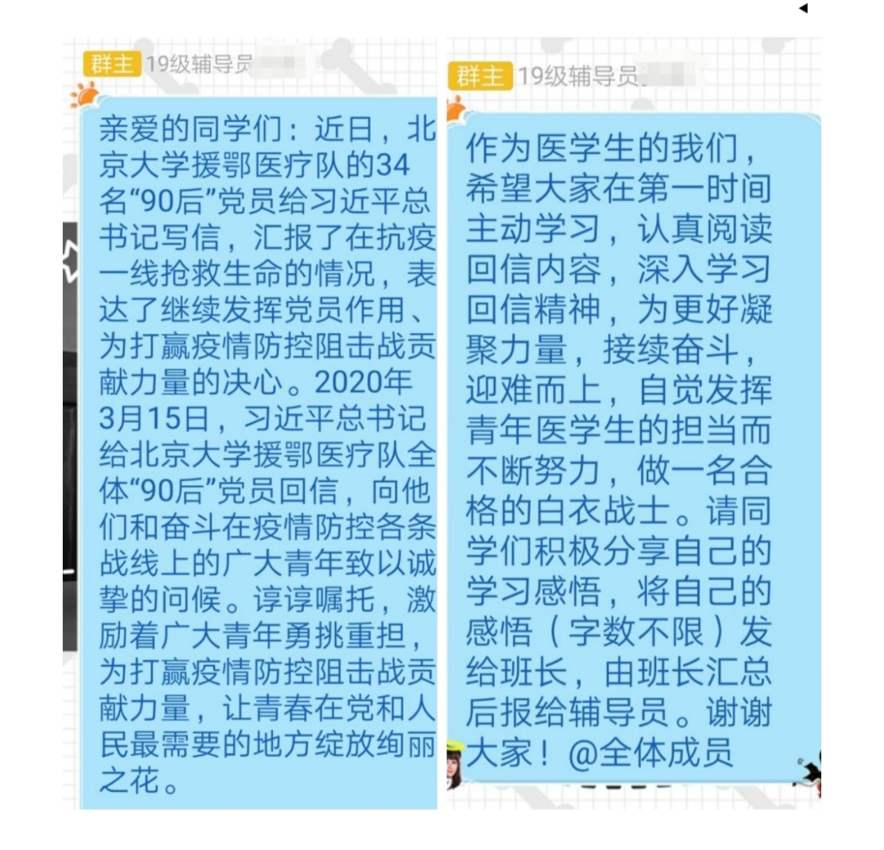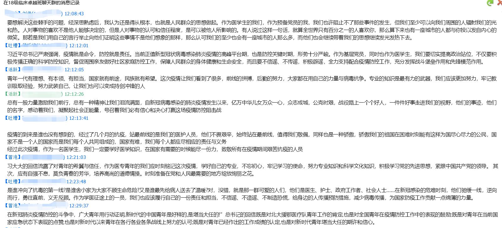 3月15日,习近平总书记给北京大学援鄂医疗队全体“90后”党员的回信,向奋斗在疫情防控各战线上的广大青年致以诚挚的问候。习总书记的回信在青年团员中引起热烈反响,它激励着广大青年勇挑重担,为打赢疫情防控阻击战贡献力量,让青春在党和人民最需要的地方绽放绚丽之花。我院对此积极响应,组织同学召开班会,以座谈学习、交流体会等形式认真学习回信精神。