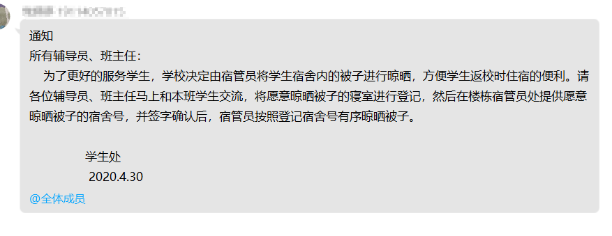 在生活方面,为了更好的服务学生,学校决定由宿管员将学生宿舍内的被子进行晾晒,方便学生返校时住宿的便利。为保护学生隐私,学校将通过寝室长,以寝室为单位,将愿意晾晒被子的寝室进行登记,然后在楼栋宿管员处提供愿意晾晒被子的宿舍号,签字确认后,宿管员按照登记宿舍号有序晾晒被子。这一暖心举动让学生们不禁赞叹不已。