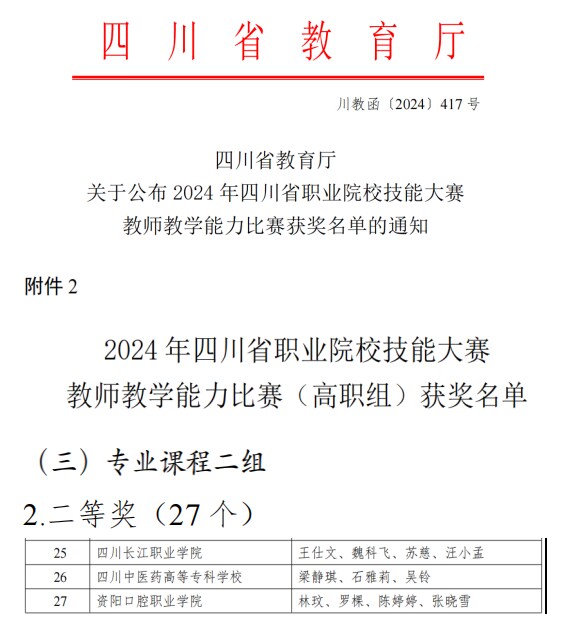 近日,四川省教育厅公布了2024年四川省职业院校技能大赛教师教学能力比赛获奖名单,我院梁静琪、石雅莉、吴铃教师团队荣获专业课程二组二等奖;