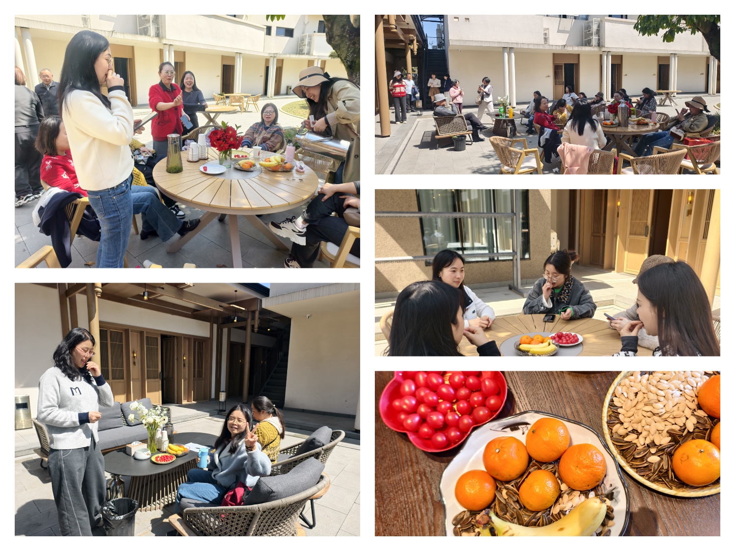 午后的庭院阳光明媚,茶话会环节温馨而热烈。大家围坐在圆桌旁,桌上摆放着橘子、小番茄、瓜子等茶点,老师们或分享育儿趣事,或交流教学心得,或探讨科研方向,轻松的氛围让平日里忙碌的教职工们卸下疲惫,增进了彼此的了解与情谊。