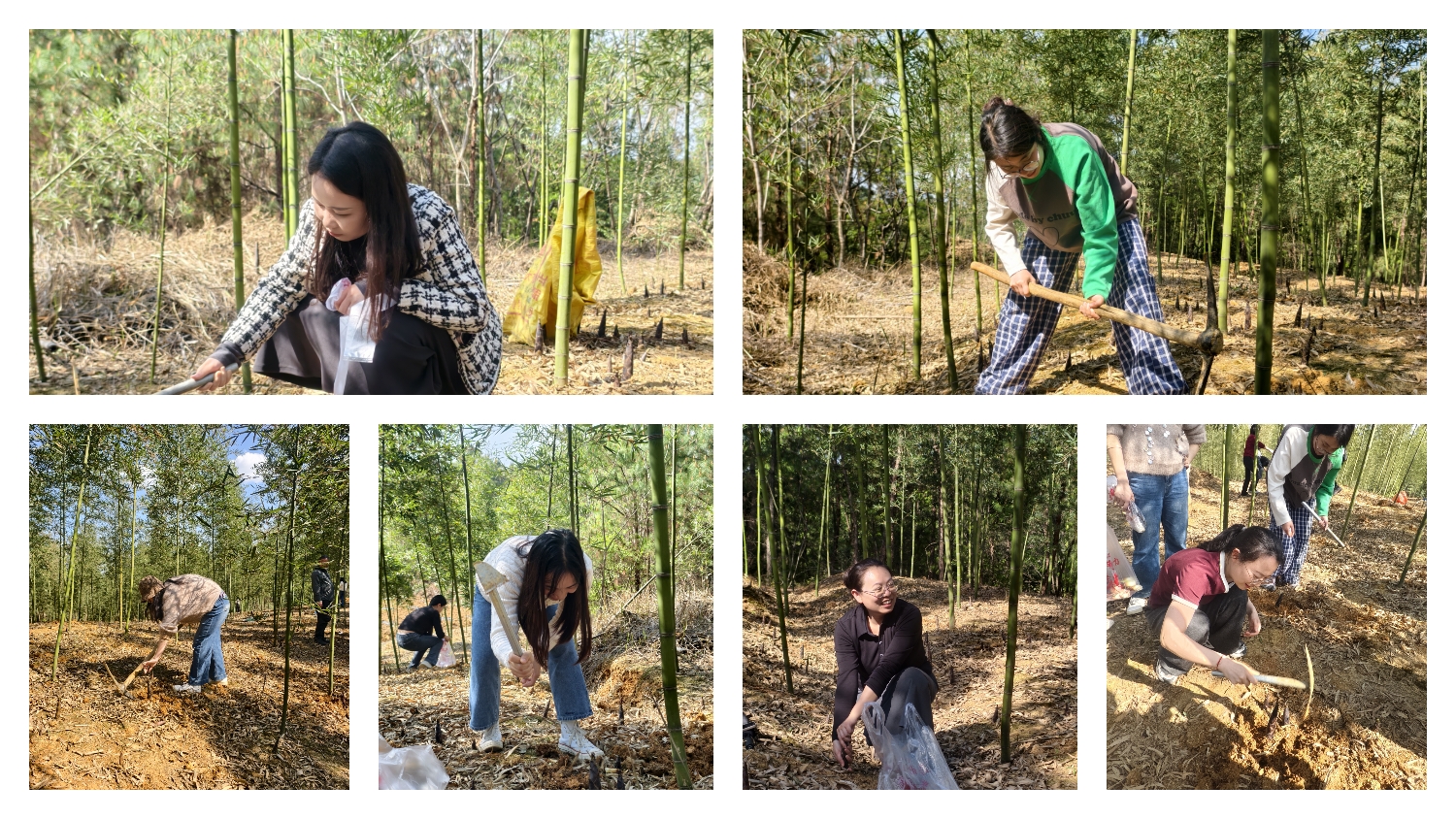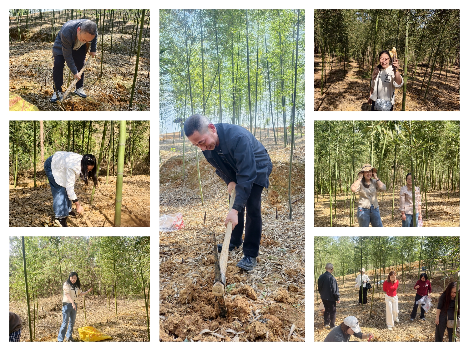 在茂密的竹林中,教职工们俯身探寻破土而出的春笋,用锄头小心清理周边泥土,将鲜嫩的春笋完整挖出,体验着劳作的乐趣与收获的喜悦。