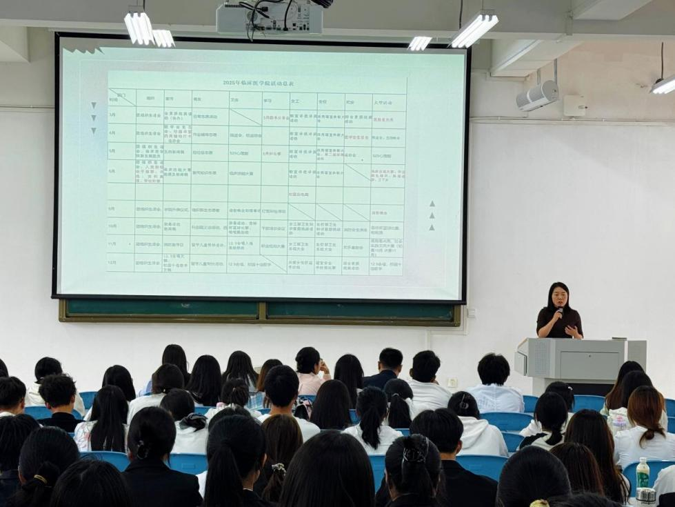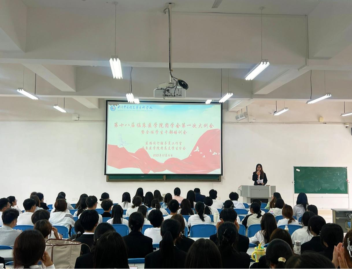 为提升学生干部的综合能力与团队凝聚力,2025年10月16日中午,临床医学院第十八届团学会第一次大例会暨全体学生干部培训会在北区2-2-1教室隆重举行。学院党总支副书记叶忠老师、团总支书记丁亚娜老师及各年级辅导员莅临指导,团学会全体成员与大一大二班干部共同参会。