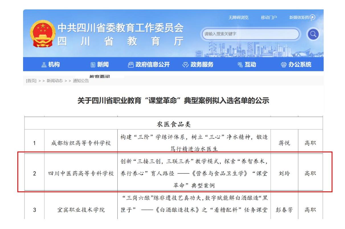 近日,根据《四川省教育厅关于开展职业教育“课堂革命”典型案例评选工作的通知》精神,经学校自愿申报、教育厅组织形式审查、专家评审,四川省教育厅发布了《关于四川省职业教育“课堂革命”典型案例拟入选名单》,拟入选职业教育“课堂革命”典型案例54个,其中中职18个、高职36个。其中,我院刘玲、龚琬、李君、胥可教师团队《创新“三接三创,三联三共”教学模式,探索“养智养术,养行养心”育人路径——<营养与食品卫生学>“课堂革命”典型案例》入选,这也是高职医药卫生大类唯一入选的案例。